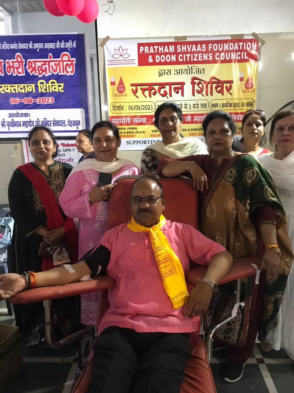 देहरादून। प्रथम श्वास फाउंडेशन, सिटीजन काउंसिल व पृथ्वीनाथ महादेव मंदिर सेवा दल की ओर से एक रक्तदान शिविर का आयोजन रेसकोर्स स्तिथ अमरीक हाल में किया गया जहां पर 63 यूनिट ब्लड एकत्र कर 189 लोगों को जीवनदान मिला। कार्यक्रम का उद्घाटन दून इंटरनेशनल स्कूल के ऑनर मिस्टर डीएस मान ब्रिगेडियर के जी बहल, डॉ बक्शी, श्वेता राय तलवार, सुनील अग्रवाल, जोगिंदर पुंडीर,रविंद्र सिंह आनंद, डॉक्टर कृष्ण अवतार, सोनिया आनंद , सिंधु गुप्ता , डॉ कौशिक, सतपाल, पूर्व विधायक राजकुमार, अशोक वर्मा, डॉ तृप्ति जुयाल सेमवाल , जैसल जी सुभाष जोशी, मोंटी कोहली जी ने दीप प्रज्वलन कर विधिवत आरंभ किया।