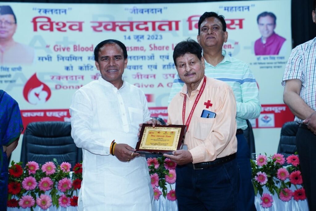 देहरादून। उत्तराखंड राज्य एड्स नियंत्रण समिति एवं उत्तराखंड ब्लड ट्रांसफ्यूजन काउंसिल द्वारा सर्वे चैक स्थित आईआरडीटी के सभागार में विश्व रक्तदाता दिवस पर आयोजित राज्य स्तरीय गोष्ठी में रक्तदान से संबंधित अपने ओजस्वी विचारों से युवाओं को स्वैच्छिक रक्तदान के प्रति जागरूक व प्रेरित करने में सफल रहे। यूथ रेडक्रास कमेटी के चेयरमैन व रक्तदान के क्षेत्र में लगभग 150 से अधिक बार स्वयं रक्तदान कर चुके भारत रत्न पंडित गोविंद बल्लभ पंत रक्तदाता शिरोमणि अवार्ड, रोटरी इंटरनेशनल लाईफ टाईम अचीवमेंट अवॉर्ड, लायंस इंटरनेशनल क्लब अवार्ड, यूनेस्को क्लब अवार्ड, रक्तवीर नायक अवार्ड ,यूथ आइकॉन अवार्ड,रक्त रत्न अवॉर्ड, गोल्डन ब्लड डोनर अवार्ड, सर्वश्रेष्ठ रक्त दानवीर समाज सेवा अवार्ड, रक्तदाता सम्राट अवार्ड, रक्त भूषण अवॉर्ड, सुपर सेंचुरियन ब्लड डोनर अवार्ड, अपना परिवार अवार्ड, तथा डॉ० कार्ल लैण्डस्टीनर अवाॅर्ड ,सहित दर्जनों अंतर्राष्ट्रीय, राष्ट्रीय तथा राज्य स्तरीय अवार्डों से नवाजे जा चुके अनिल वर्मा ने स्वास्थ्य मंत्री डॉ० धन सिंह रावत का उनकी सराहना करते हुए विशेष रूप से सम्मानित किये जाने पर हार्दिक धन्यवाद् एवं आभार व्यक्त किया है।