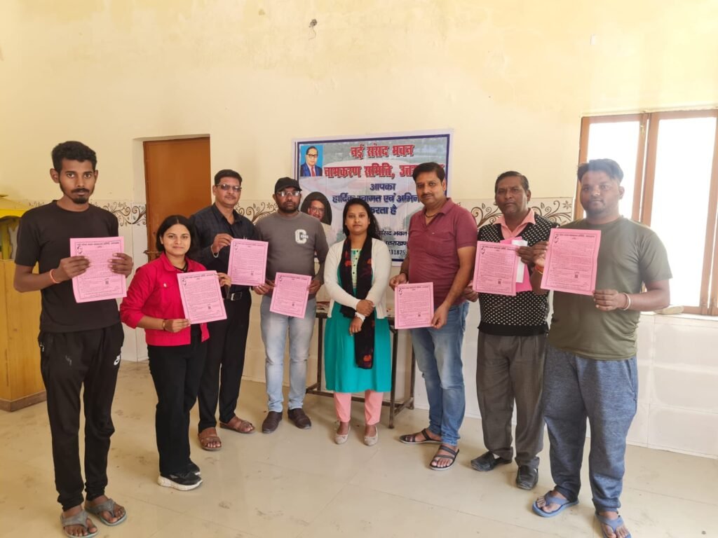 देहरादून। नई संसद भवन नामकरण समिति उत्तराखंड की रविवार को डीएल रोड देहरादून रविदास मंदिर में एक मीटिंग हुई। बैठक में सभी उपस्थित साथियों ने समिति को सहयोग करने को आश्वस्त किया। बैठक की अध्यक्षता समिति के प्रदेश उपाध्यक्ष गीताराम जायसवाल ने की और संचालन महामंत्री संजय कुमार ने किया। मीटिंग में बतौर मुख्य अतिथि प्रदेश प्रवक्ता इंजी शैलजा सिंह आर्य ने शिरकत की। आर्य ने बताया कि 28 नवम्बर को दिल्ली के रामलीला मैदान में विशाल रैली का आयोजन किया जा रहा है, जिसमे उत्तराखंड से हजारों की संख्या में लोग प्रतिभाग करेंगे। इसके अतिरिक्त स्व. भगवान दास टम्टा की दूसरी पुण्यतिथि पर श्रद्धांजलि अर्पित की गई। बैठक में समिति का विस्तार करते हुए गीताराम जायसवाल को प्रदेश उपाध्यक्ष और संजय कुमार को प्रदेश महामंत्री, सौरभ कुमार को डीएल रोड वार्ड संयोजक और अतुल कुमार को वार्ड सचिव एवं अशोक कुमार को जिला उपाध्यक्ष देहरादून नियुक्त किया गया। बैठक में नोहर सिंह, पूर्ण सिंह, ऋषिका, ध्यान सिंह, निम्मी सिंह आदि लोग मौजूद रहे।