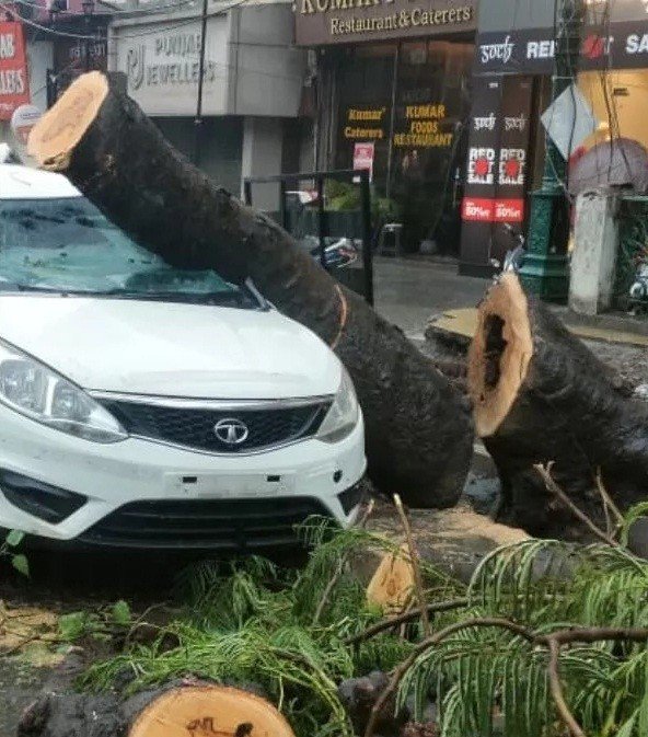 इसके बाद सुबह करीब 9 बजे गांधी पार्क के निकट कार के ऊपर भारी भरकम पेड़ गिर गया। गनीमत रही कि कार के अंदर कोई नहीं था। घटना के बाद दोनों तरफ जाम लग गया। फायर ब्रिगेड की टीम ने पेड़ काटकर यातायात सुचारु करवाया। दूसरी ओर सुबह से ही चल रही बारिश के कारण चारों ओर से यातायात जाम हो गया। जगह-जगह सड़कों पर पानी भरने के कारण वाहन आगे नहीं बढ़ पाए।