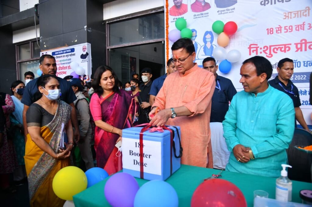 देहरादून। मुख्यमंत्री पुष्कर सिंह धामी ने शुक्रवार को महात्मा गांधी शताब्दी जिला चिकित्सालय में कोविड टीकाकरण अमृत महोत्सव का स्वयं टीका लगाकर शुरूआत की। प्रदेश में 18 से 59 आयुवर्ग के सभी लाभार्थियों हेतु निशुल्क प्रिकाशन डोज की शुरूआत करते हुए मुख्यमंत्री ने सभी लाभार्थियों से टीकाकरण में सहयोगी बनने को कहा। उन्होंने कहा कि कोविड की रोकथाम के लिये टीकाकरण जरूरी है। राज्य सरकार द्वारा इसके लिये सभी आवश्यक व्यवस्थायें सुनिश्चित की गई है।