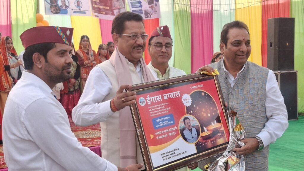 देहरादून। बंजारावाला में गंगोत्री एंक्लेव रेजिडेंट वेलफेयर सोसाइटी द्वारा इगास बग्वाल कार्यक्रम धूमधाम से मनाया गया। इस कार्यक्रम में कलाकारों द्वारा कई सांस्कृतिक प्रस्तुतियां दी गई। इगास बग्वाल कार्यक्रम में विधायक विनोद चमोली, विधायक बृजभूषण गैरोला, प्रदेश कांग्रेस के वरिष्ठ उपाध्यक्ष संगठन सूर्यकांत धस्माना, प्रसिद्द न्यूरो सर्जन डॉक्टर महेश कुड़ियाल आदि शामिल हुए। आयोजकों द्वारा अतिथियों को स्मृति चिन्ह भेंट किए गए।