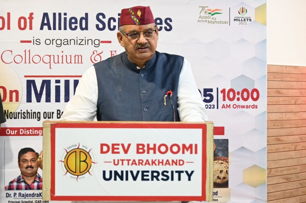 देहरादून। प्रदेश के कृषि एवं कृषक कल्याण मंत्री गणेश जोशी ने शुक्रवार को देहरादून के मांडूवाला स्थित देवभूमि उत्तराखंड युनिवर्सिटी द्वारा मिलेट वर्ष के उपलक्ष में आयोजित कार्यक्रम में बतौर मुख्य अतिथि प्रतिभाग किया। कार्यक्रम का शुभारंभ मंत्री गणेश जोशी ने दीप प्रज्वलित कर किया। इस अवसर पर मंत्री गणेश जोशी ने वहां पर लगे स्टोलों का भी अवलोकन किया। इस अवसर पर मंत्री गणेश जोशी ने देवभूमि उत्तराखंड यूनिवर्सिटी द्वारा मिलेट्स के प्रति जागरूकता बढ़ाने के उद्देश्य से आयोजित कार्यक्रम की प्रशंसा की। साथ ही, उन्होंने खुशी व्यक्त कि विश्वविद्यालय की छात्र छात्राएं मोटे अनाज को जान रहे हैं, उन्होंने चिंता भी जाहिर की और कहा वास्तविकता ये है कि आज की पीढ़ी मोटे अनाज के फायदे नहीं जानती है। खासतौर से शहरों में रहने वाले मोटे अनाज यानी मिलेट्स के प्रति जागरूक नहीं हैं। ये ऐसा सुपरफूड है, जो प्रोटीन, फाइबर, विटामिन बी, कैल्शियम, आयरन और न जाने कितने पोषक तत्वों से भरा पडा है।