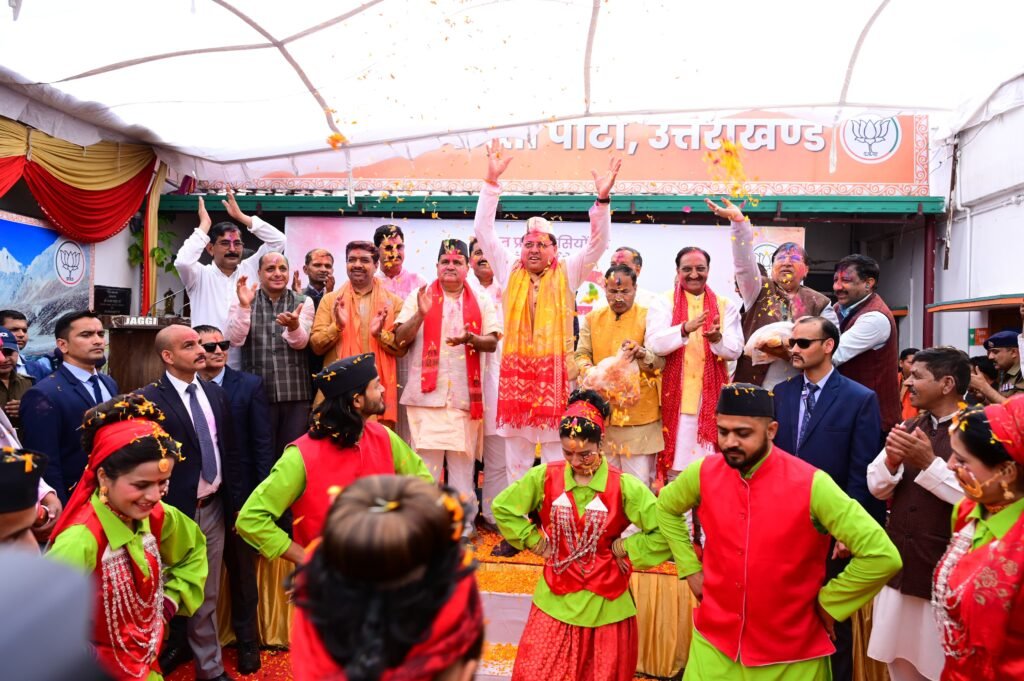 बलबीर रोड स्थित कार्यालय में आयोजित इस कार्यक्रम में प्रदेश अध्यक्ष महेंद्र भट्ट ने मुख्यमंत्री पुष्कर सिंह धामी, पूर्व मुख्यमंत्री डॉक्टर रमेश पोखरियाल निशंक, राज्यसभा सांसद नरेश बंसल का सबसे पहले पुष्पों से स्वागत किया। वहीं मंच पर मौजूद प्रदेश महामंत्री संगठन अजय कुमार, प्रदेश महामंत्री खिलेंद्र चौधरी, राजेंद्र बिष्ट, प्रदेश कोषाध्यक्ष पुनीत मित्तल, प्रदेश कार्यालय सचिव कुस्तुभानंद जोशी, प्रदेश मीडिया प्रभारी मनवीर चौहान ने मुख्यमंत्री को गुलाल से टीका लगाकर, फूलों से होली खेली। कार्यक्रम में कैबिनेट मंत्री गणेश जोशी, राजपुर विधायक खजान दास, रुड़की विधायक प्रदीप बत्रा, सरकार में दायित्वधारी डाक्टर देवेंद्र भसीन, मधु भट्ट, डाक्टर गीता खन्ना आदि सैकड़ों की संख्या में मौजूद कार्यकर्ताओं के साथ मुख्यमंत्री ने पुष्प वर्षा कर जमकर होली खेली। इससे पूर्व सांस्कृतिक कलाकारों द्वारा होली के गीतों पर शानदार प्रस्तुति देकर, माहौल को रंगीन और होलीमय बनाया।