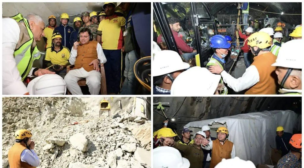 श्रमिकों से बात करते हुए मुख्यमंत्री ने कहा कि राहत एवं बचाव कार्य युद्ध स्तर पर चल रहा है। प्रधानमंत्री नरेंद्र मोदी निरंतर स्थिति पर नजर बनाएं हुए हैं और नियमित रूप से रेस्क्यू अभियान की प्रगति की जानकारी ले रहे हैं। पूरा देश आपके साथ खड़ा है। राज्य सरकार भी हर स्थिति में आपके साथ खड़ी है। सभी श्रमिक भाई हौसला बनाएं रखें। सीएम पुष्कर सिंह धामी ने कहा आप सभी की मेहनत से रेस्क्यू कार्य सफलता की ओर बढ़ रहा है। उन्होंने कहा टनल में फंसी बहुमूल्य जिंदगियों को बचाने में श्रमिकों का योगदान हमेशा याद रखा जाएगा। उन्होंने कहा रेस्क्यू ऑपरेशन में रात दिन जुटे श्रमिकों को किसी तरह की दिक्कत ना हो इसका भी विशेष ध्यान रखा गया है। इस मौके पर मुख्यमंत्री ने ड्रिलिंग के दौरान पाइप के मुहाने पर फंसे धातु के टुकड़ों को पाइप के अंदर रेंगकर काटने के अत्यंत दुष्कर कार्य को सफलता पूर्वक अंजाम देने वाले श्रमिक प्रदीप यादव एवं बलविंदर की भी सराहना की। मुख्यमंत्री पुष्कर सिंह धामी ने ऑगर मशीन से ड्रिलिंग की प्रक्रिया की भी जानकारी ली। उन्होंने टनल में फंसे श्रमिकों को भेजे जाने वाले भोजन की गुणवत्ता की भी जांच की। मुख्यमंत्री ने कहा श्रमिकों को निकालने के लिए हर संभव प्रयास जारी रहे। हम सभी की प्राथमिकता उन्हें सुरक्षित बाहर निकालना है। सीएम पुष्कर सिंह धामी एवं केंद्रीय राज्य मंत्री जनरल (रिटा.) वीके सिंह ने राहत बचाव कार्य में जुटे एनडीआरएफ, एसडीआरएफ, पुलिस जवानों स्वास्थ्य कर्मियों एवं इंजीनियरो से भी मुलाकात कर उनका हौसला बढ़ाया।