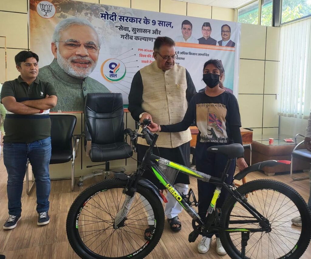 वुशु खिलाड़ी आयशा चैहान को मंत्री जोशी ने साइकिल भेंट की