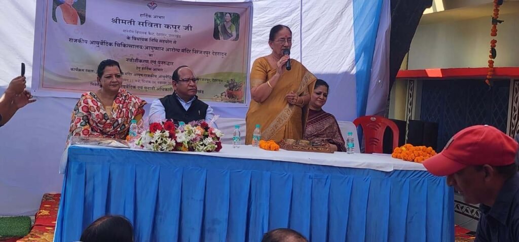 देहरादून। विधायक कैंट सविता कपूर ने बृहस्पतिवार को आयुष्मान आरोग्य मंदिर (आयुष), राजकीय आयुर्वेदिक चिकित्सालय, निरंजनपुर के सौंदर्यकृत भवन का उद्घाटन किया गया। इस अवसर पर विधायक ने कहा कि सरकार आमजन को बेहतर स्वास्थ्य सुविधाएँ उपलब्ध कराने के लिए निरंतर प्रयासरत है। इस मौके पर जिला आयुर्वेदिक एवं यूनानी अधिकारी ने विधायक को पंचायत भवन में संचालित चिकित्सालय भवन को आयुष विभाग को हस्तांतरित करने का प्रस्ताव भी रखा। इस पर विधायक ने पूर्ण आश्वासन दिया गया।