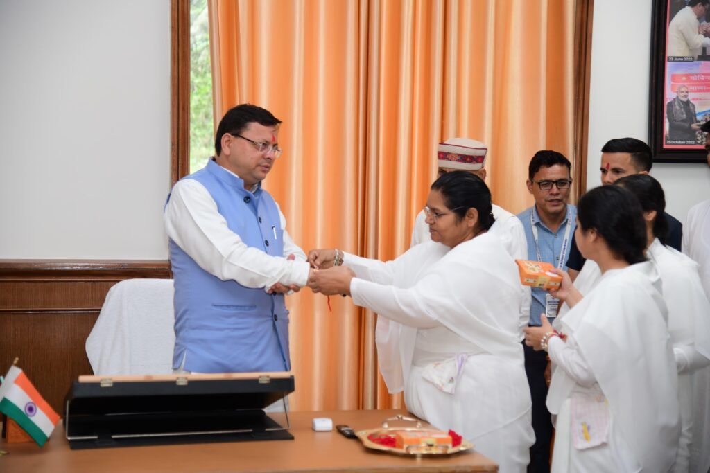 बहनों ने भराड़ीसैंण में मुख्यमंत्री की कलाई पर रक्षा सूत्र बांधे