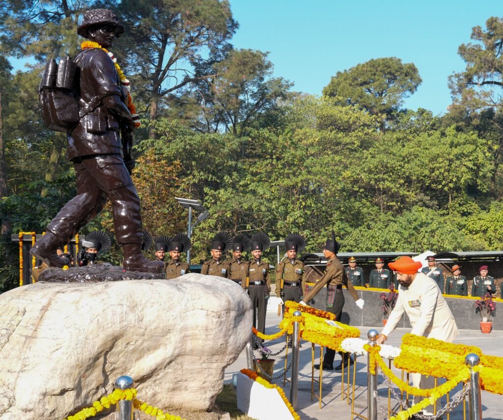 देहरादून। राज्यपाल लेफ्टिनेंट जनरल गुरमीत सिंह (से नि) ने मंगलवार को विजय दिवस के अवसर पर शौर्य स्थल, देहरादून में मातृभूमि की रक्षा हेतु अपने प्राणों का सर्वोच्च बलिदान देने वाले वीर शहीदों को पुष्पचक्र अर्पित कर श्रद्धांजलि दी। इस अवसर पर राज्यपाल ने उपस्थित सेवारत एवं पूर्व सैनिकों से भेंट कर उनसे संवाद किया तथा राष्ट्र की रक्षा में उनके अमूल्य योगदान की सराहना की। इस अवसर पर राज्यपाल ने 1971 के भारत-पाकिस्तान युद्ध की ऐतिहासिक, रणनीतिक एवं निर्णायक सैन्य विजय को स्मरण करते हुए कहा कि यह युद्ध भारत के सैन्य इतिहास में स्वर्णिम अध्याय है। भारतीय सशस्त्र बलों ने अद्वितीय शौर्य, साहस और कुशल रणनीति का परिचय देते हुए न केवल दुश्मन के 93 हजार सैनिकों को आत्मसमर्पण के लिए विवश किया, बल्कि पाकिस्तान के विभाजन के साथ एक नए राष्ट्र, बांग्लादेश के निर्माण का मार्ग भी प्रशस्त किया।