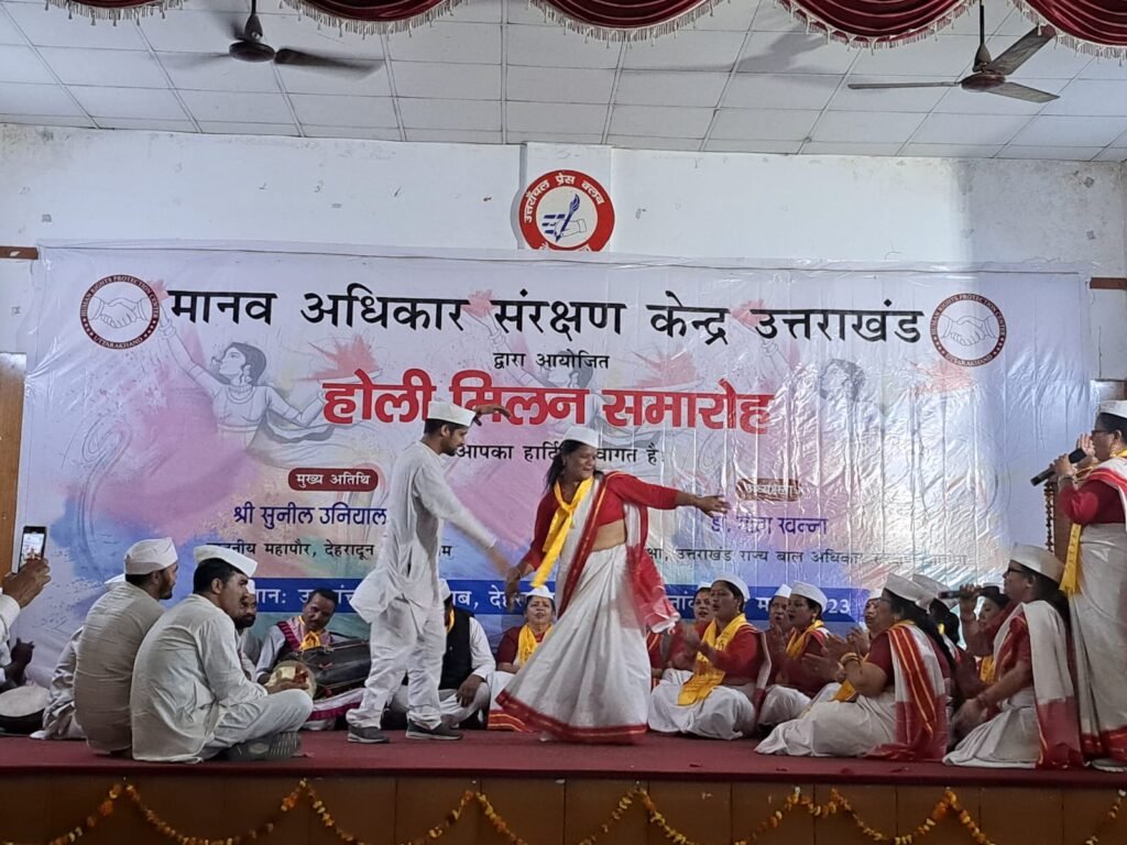 देहरादून। मानव अधिकार संरक्षण केंद्र उत्तराखंड ओर से होली मिलन समारोह का आयोजन उत्तरांचल प्रेस क्लब में किया गया जिसमें बतौर मुख्य अतिथि अध्यक्ष उत्तराखंड राज्य बाल अधिकार संरक्षण आयोग डॉक्टर सीता खन्ना मौजूद रही। इस मौके पर उत्तराखंड की संस्कृति होली के महत्व को दर्शाते हुए उन्होंने कुमाऊं की खड़ी होली प्रस्तुत कर सभागार में मौजूद सभी को नाचने झूमने पर मजबूर कर दिया। सभी होलियार प्रेस क्लब के गेट से ही होगी गाते हुए सभागार में पहुंचे जिसे देखकर हर कोई खड़े होकर उनका स्वागत करने पर मजबूर हो गया और नाचने पर मजबूर हो गया।