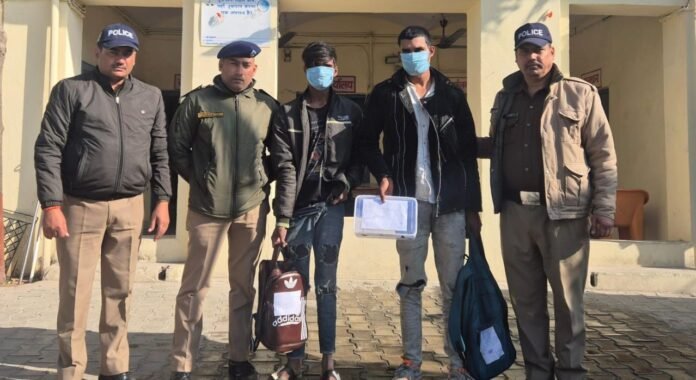 जानकारी के अनुसार बीती सुबह सचिन दिवाकर पुत्र गंगाराम निवासी कनखल हरिद्वार द्वारा थाना कनखल में तहरीर देकर बताया गया कि बीती रात किसी अज्ञात चोर ने जगजीतपुर स्थित उनकी अंग्रेजी शराब की दुकान के पिछले गेट का ताला तोडकर दुकान के अन्दर काउन्टर में रखा बैग जिसमें लगभग 37 हजार रूपये व कुछ दस्तावेज रखे थे, को चोरी कर लिये गये है। मामले में पुलिस ने मुकदमा दर्ज कर चोरों की तलाश शुरू कर दी गयी। चोरों की तलाश में जुटी पुलिस टीम ने कड़ी मशक्कत के बाद खोखरा तिराहा जगजीतपुर के पास निर्माणाधीन फ्लाईओवर के नीचे से दो संदिग्ध को दबोचकर तलाशी ली गई तो एक बैग जिममें 37150 रूपये, ठेके से सम्बन्धित दस्तावेज एवं एक तमंचा 12 बोर बरामद हुआ। पूछताछ में पता चला कि पकड़े गए आरोपी दिनांक 17 फरवरी को अपने जिले श्रीवस्ती से हरिद्वार आये थे तथा रात के समय घूमते हुए जगजीतपुर अग्रेजी शराब के ठेके के पास पहुँचे। पैसो की कमी के चलते दोनों ने ठेके की रैकी की और फिर पिछली तरफ ही सो गये। आधी रात को मौका पाकर दोनों ने पिछली तरफ बने दरवाजे का ताला तोडकर अन्दर काउन्टर से पैसो से भरे बैग को चोरी कर लिया। आरोपी आज फिर किसी दूसरी दुकान में वारदात को अंजाम देकर रात में ट्रेन के जरिए श्रीवस्ती जाने की फिराक में थे। आरोपी अय्याश पूर्व में भी मुम्बई थाना शाहू नगर व थाना अम्बावली से चोरी के अपराध में जेल जा चुका है तथा अभी जमानत पर है। पकड़े गये आरोपियों के नाम अय्याश खान पुत्र जुमई खां निवासी बनकटी थाना हरदथ नगर ग्रन्ट जिला श्रीवस्ती उ.प्र. व भूरे खान पुत्र गुलाब खान निवासी बनकटी थाना हरदथ नगर ग्रन्ट जिला श्रीवस्ती उ.प्र. बताया जा रहा है।