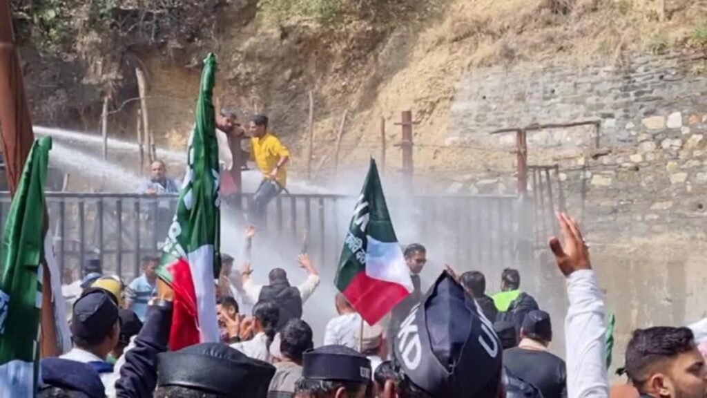 गैरसैंण। उत्तराखंड की ग्रीष्मकालीन राजधानी गैरसैंण के भराड़ीसैंण विधानसभा भवन के अंदर एक तरफ राज्यपाल का अभिभाषण चल रहा था, को दूसरी तरफ विधानसभा के बाहर सड़क पर हंगामा हो रहा था। उत्तराखंड क्रांति दल (यूकेडी) के सैकड़ों कार्यकर्ता जुलूस की शक्ल में विधानसभा की ओर बढ़ रहे थे। आखिर में पुलिस बल ने कार्यकर्ताओं को रोकने का प्रयास शुरू किया। प्रदर्शनकारियों को रोकने के लिए पुलिस को वाटर कैनन का भी प्रयोग करना पड़ा। इस दौरान कार्यकर्ताओं और पुलिस जवानों के बीच जमकर धक्का मुक्की हुई।