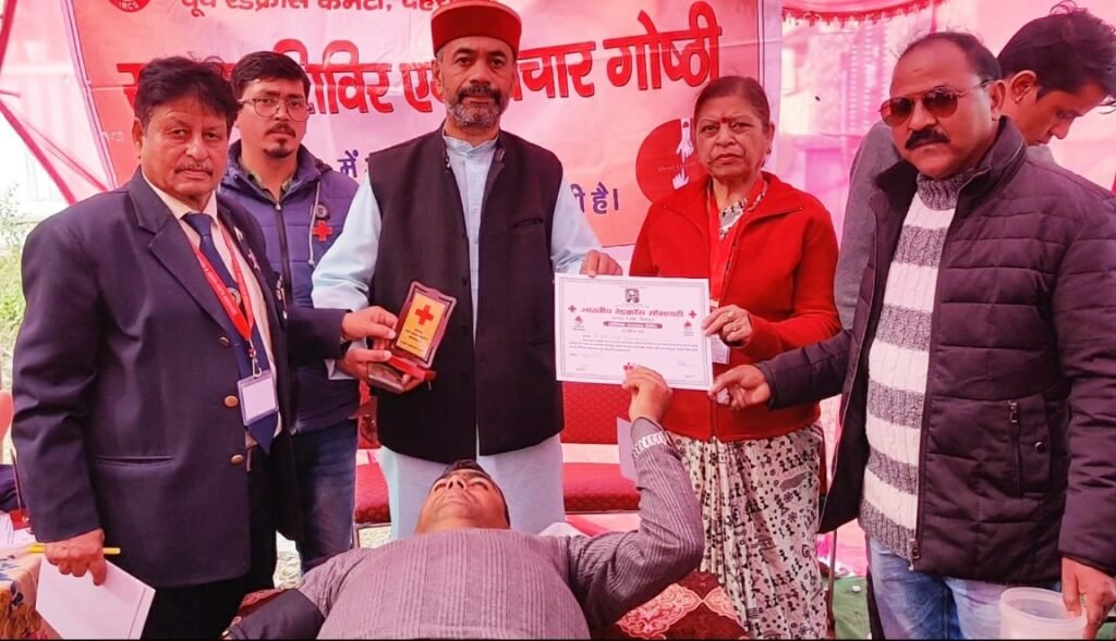 देहरादून। जिला यूथ रेडक्रास कमेटी के तत्वावधान ननूरखेडा़ स्थित शिक्षा निदेशालय के प्रांगण में आयोजित रक्तदान शिविर एवं विचार गोष्ठी में अपनी तदर्थ नियुक्ति की मांग को लेकर धरने पर बैठे माध्यमिक अतिथि शिक्षक संघ के संघर्षरत शिक्षक-शिक्षिकाओं ने अपनी रचनात्मक सोच का परिचय देते हुए कुल 84 यूनिट रक्तदान करके एक अनुकरणीय उदाहरण प्रस्तुत किया। रक्तदान शिविर का उद्घाटन मुख्य अतिथि पूर्व राज्यमंत्री एवं वरिष्ठ भाजपा नेता रविंद्र जुगरान, विशिष्ट अतिथि मुख्यमंत्री के प्रतिनिधि किशोर भट्ट, कार्यक्रम अध्यक्ष यूथ रेडक्रास कमेटी के चेयरमैन अनिल वर्मा, वरिष्ठ सदस्या मेजर प्रेमलता वर्मा, माध्यमिक अतिथि शिक्षक संघ के प्रदेश अध्यक्ष अभिषेक भट्ट कार्यकारी अध्यक्ष आशीष जोशी व प्रदेश प्रवक्ता राकेश लाल जोशी ने सम्बोधन करके किया।